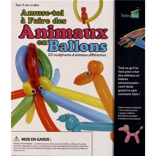 Cette trousse de sculptures en ballons, avec des instructions faciles et amusantes, plaira à tout le monde à la prochaine fête ou réunion de famille. Les enfants les adorent ! Faire des sculptures en ballons, c'est facile et amusant quand on a des instructions étape par étape toutes simples. Cette trousse comprend tous les conseils et l'équipement dont on a besoin pour réaliser 20 animaux différents, du toutou mignon à la girafe au long cou, des serpents aux gros chats de la jungle. Elle offre aussi des conseils sur la manière de décorer les animaux pour les personnaliser. Cette trousse comprend : 1 livre d'instructions ; 1 pompe à ballons ; 30 ballons à modeler ; 3 feuilles d'autocollants.