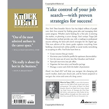 Take control of your job search--with proven strategies for success! "New York Times" bestseller Martin Yate has helped millions of people turn their lives around by finding great jobs and managing their career progress. Whether you're looking for a first job, re-entering the market, or planning a career change, Yate's unique Target Job Deconstruction method provides you with a roadmap to professional success utilizing the latest job-search strategies for the digital age. This new edition of his classic guide explains everything from building a keyword-rich online profile to social media networking to accepting an offer. You'll also learn how to: Create resumes that get resultsMaximize your LinkedIn profile for optimum discoverabilityGet the most out of career sites like Glassdoor and IndeedTurn job interviews into job offersNegotiate the best salary and benefits packageManage a career and climb the ladder of promotion"Knock 'em Dead 2017" will help you navigate the changing job-search market, land your dream job, and be better prepared to navigate the twists and turns of a long career."
