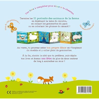 Termine les 11 portraits des animaux de la ferme en dessinant la laine du mouton, en collant les gommettes du paon ou en coloriant les plumes du canard ! Au verso, tu pourras créer ton propre décor en t'inspirant du modèle et y coller plein de gommettes. À la fin, choisis le côté que tu préfères, puis déplie ton livre et forme une frise de plus de deux mètres 11 de long à accrocher au mur !